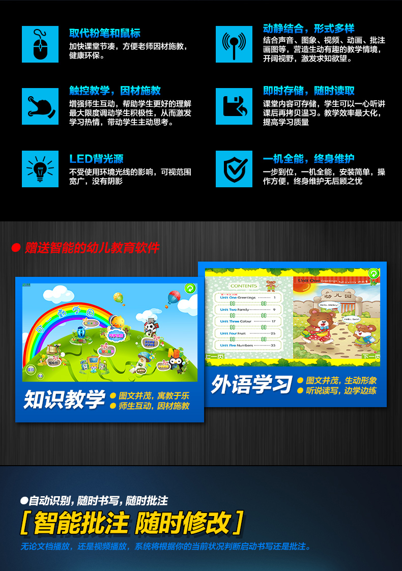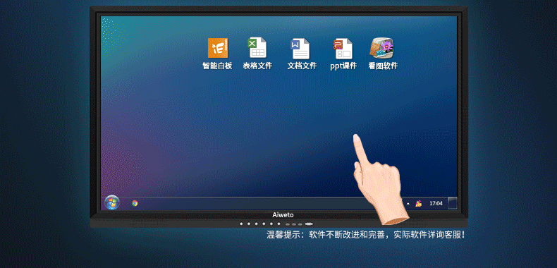 AW系列-多媒體教學(xué)一體機,高清大屏顯示,壁掛支架多種使用方式,人性化機型設(shè)計,立式與掛式兩種使用方法可交替使用,避免使用環(huán)境發(fā)生變化時產(chǎn)生的資源浪費問題采用LED背光源長壽命,低功耗,環(huán)保節(jié)能。智能電子白板,各種文件一鍵加載,多點觸控智能電子白板適用于各種商務(wù)會議,支持手寫批注,兼容日常office辦公軟件,本地、U盤、網(wǎng)盤、局域網(wǎng)數(shù)據(jù)輕松駕馭。書寫流暢,減少視覺誤差,高端企業(yè)必備,多重主題背景,筆形色彩,任意選擇。高端配置 讓運行速度,完美兼容WIN7,WIN8 隨意切換。