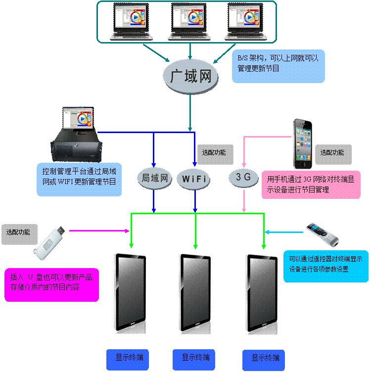 多種網(wǎng)絡(luò) 方便實(shí)用 支持局域網(wǎng)、廣域網(wǎng)等組網(wǎng)方式,終端可通過(guò)LAN、WIFI、WLAN、3G網(wǎng)絡(luò)鏈接入網(wǎng),滿足有線無(wú)線聯(lián)網(wǎng)需求;無(wú)網(wǎng)絡(luò)時(shí),將做好的節(jié)目通過(guò)U盤也能更新 |
